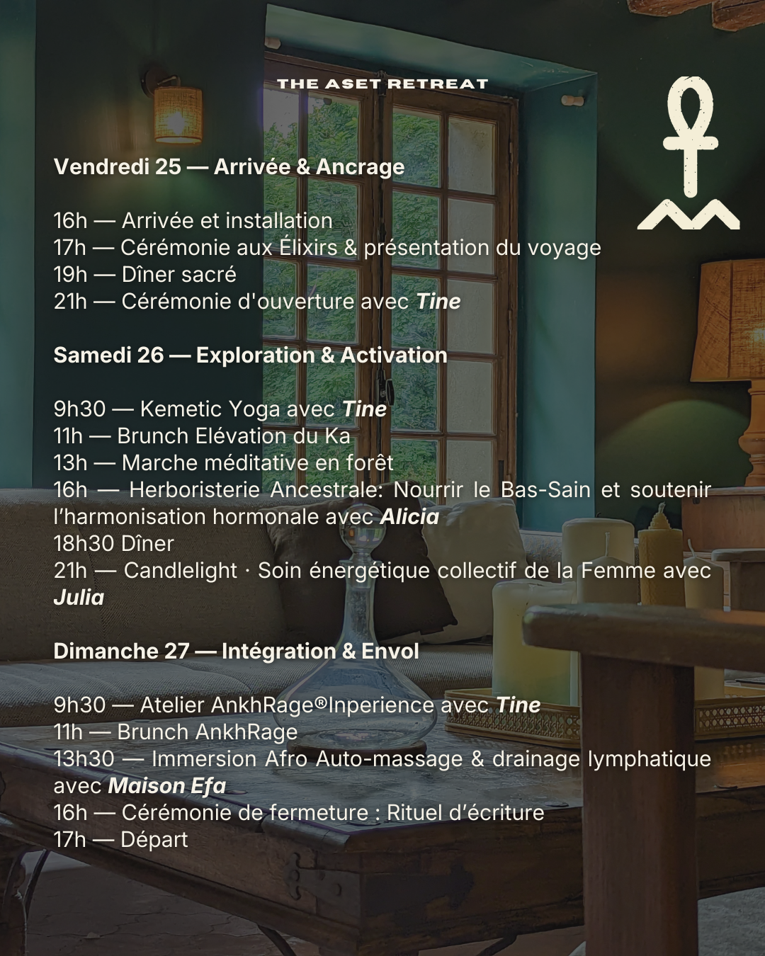 The Aset Retreat est un espace réservé aux femmes. Que tu sois déjà dans une pratique spirituelle ou que tu commences tout juste ton chemin, tu es la bienvenue.